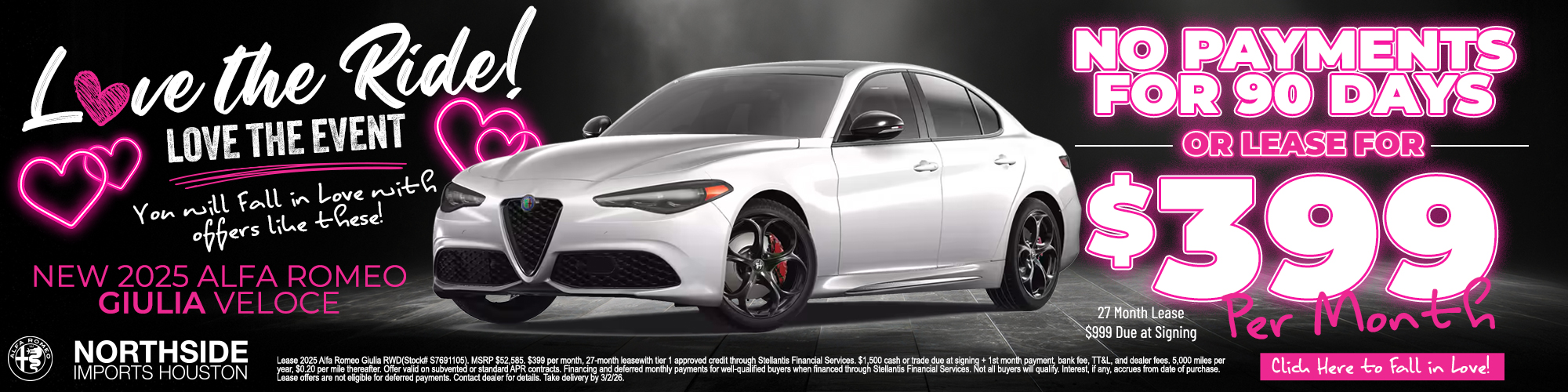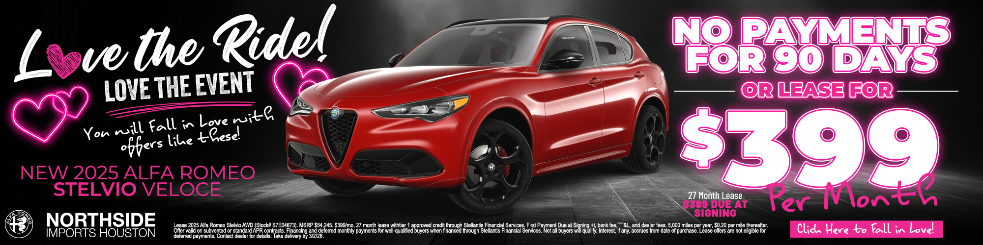 At Northside Alfa Romeo of Houston, we believe buying an Alfa Romeo should be as enjoyable as driving one. Our Alfa Romeo Finance Specials offer a variety of financing options designed to make your purchase as smooth as possible. Whether you’re looking to buy or lease, our finance experts are here to provide tailored solutions that match your requirements and budget.